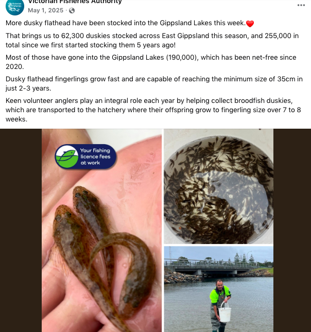 “In four years we’ve stocked more than 155,000 duskies into the Gippsland Lakes and further east, which is great news for fishers and for local businesses that rely on tourism.”