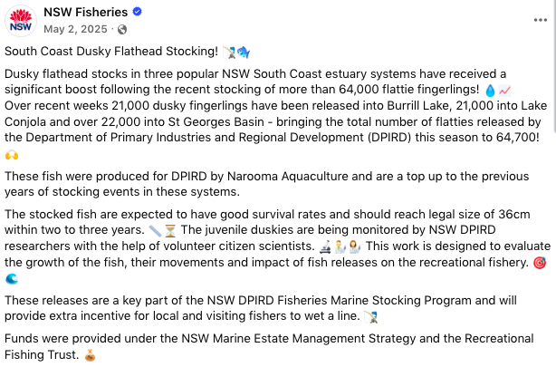 Wild populations of one of Victoria’s most prized recreational species have been given a lift thanks to the fourth year of dusky flathead stocking in East Gippsland.